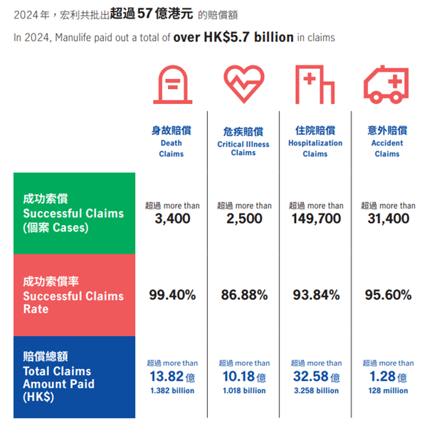 随着2024年当中的不断变化,宏利在港澳两地的赔付金高达57亿港元,较去年上升8.95%,平均成功索偿率(赔付率)高达94.12%,维持较高水平!
